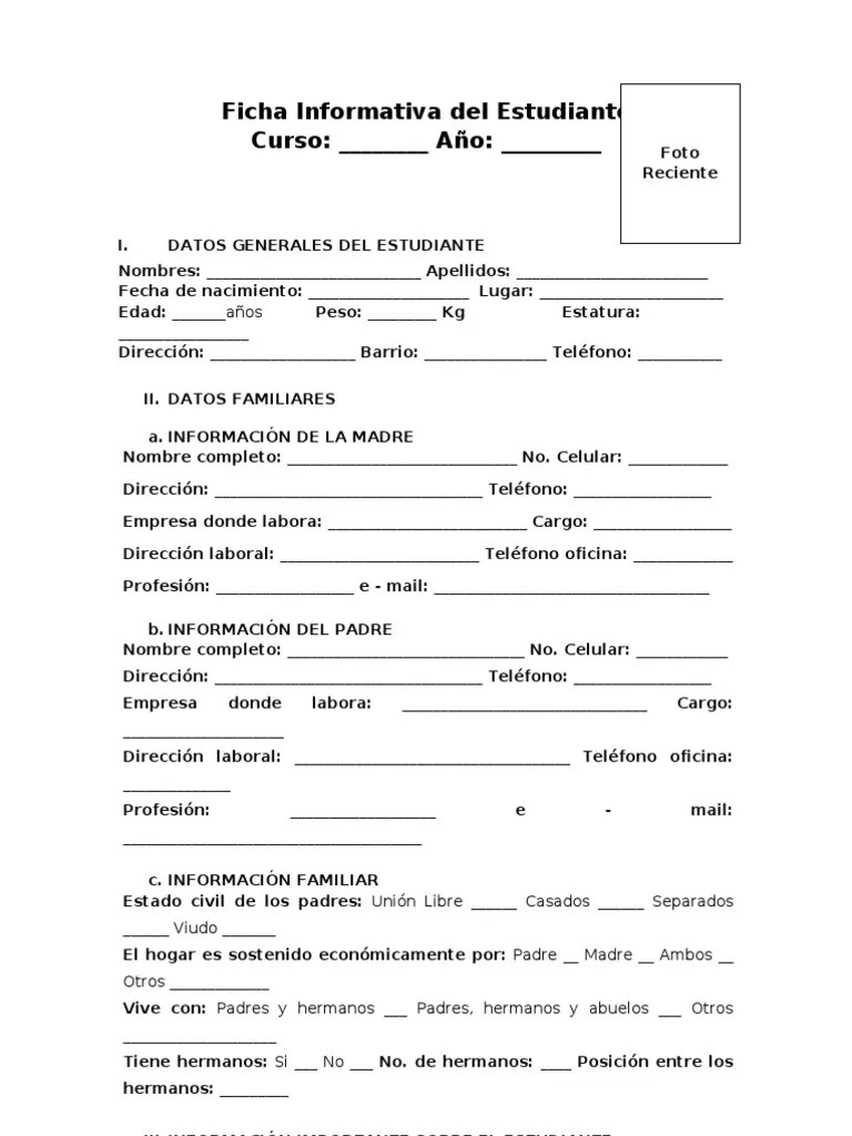 La finalidad de esta ficha personal es la recogida de información del alumno/a tanto en aspectos personales (médicos y familiares). Aula de audición y lenguaje. El objetivo final, es que todo docente tenga la mayor información posible de cada alumno dentro de un grupo clase, para controlar y mejorar la . La ficha personal del estudiante, en la cual podrán registrar todos los datos del alumno y también los datos del tutor y el padre y madre de .